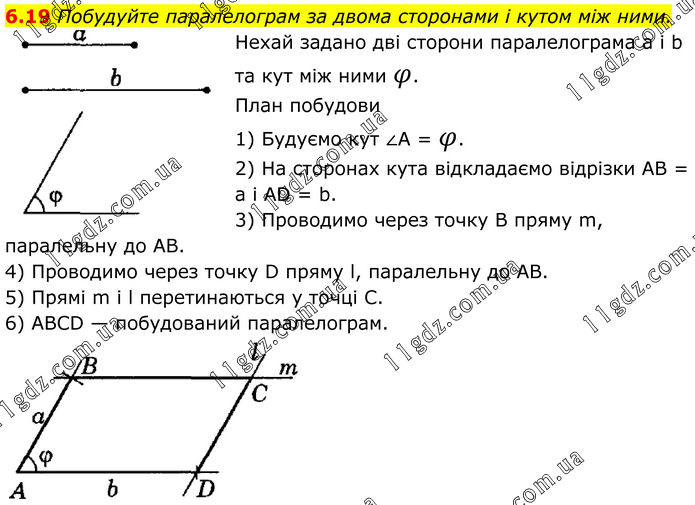 6.19 Побудуйте паралелограм за двома сторонами і кутом між ними. Нехай задано дві сторони паралелограма а і b та кут між ними φ. План побудови 1) Будуємо кут ∠A = φ. 2) На сторонах кутa відкладаємо відрізки AB = а і AD = b. 3) Проводимо через точку В пряму m, паралельну до AB. 4) Проводимо через точку D пряму l, паралельну до AB. 5) Прямі m і l перетинаються у точці С. 6) ABCD — побудований паралелограм.