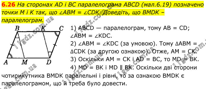 6.26 На сторонах AD і BC паралелограма ABCD (мал.6.19) позначено точки M і K так, що ∠ABM = ∠CDK. Доведіть, що BMDK – паралелограм. 1) ABCD — паралелограм, тому AB = CD; ∠ABM = ∠KDC. 2) ∠ABM = ∠KDC (за умовою). Тому ∆ABM = ∆CDK (за другою ознакою). Отже, AM = CK. 3) Оскільки AM = CK і AD = BC, то MD = ВK. 4) MD = BK і MD ∥ BK. Оскільки дві сторони чотирикутника BMDK паралельні і рівні, то за ознакою BMDK є паралелограмом, що й треба було довести.