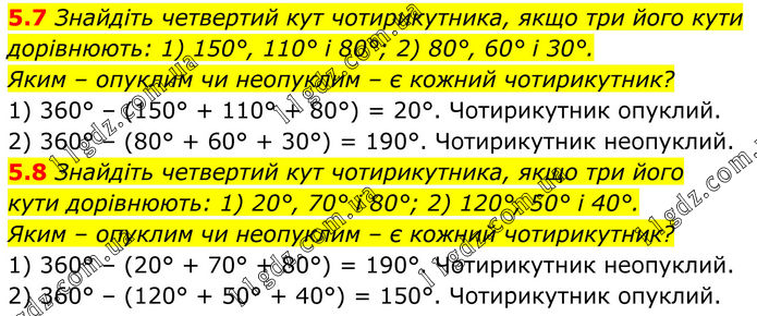 5.7 Знайдіть четвертий кут чотирикутника, якщо три його кути дорівнюють: 1) 150°, 110° і 80°; 2) 80°, 60° і 30°. Яким – опуклим чи неопуклим – є кожний чотирикутник? 1) 360° – (150° + 110° + 80°) = 20°. Чотирикутник опуклий. 2) 360° – (80° + 60° + 30°) = 190°. Чотирикутник неопуклий. 5.8 Знайдіть четвертий кут чотирикутника, якщо три його кути дорівнюють: 1) 20°, 70° і 80°; 2) 120°, 50° і 40°. Яким – опуклим чи неопуклим – є кожний чотирикутник? 1) 360° – (20° + 70° + 80°) = 190°. Чотирикутник неопуклий. 2) 360° – (120° + 50° + 40°) = 150°. Чотирикутник опуклий.