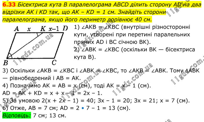 6.33 Бісектриса кута B паралелограма ABCD ділить сторону AD на два відрізки AK і KD так, що AK – KD = 1 см. Знайдіть сторони паралелограма, якщо його периметр дорівнює 40 см. 1) ∠AKB = ∠KBC (внутрішні різносторонні кути, утворені при перетині паралельних прямих AD і BC січною BK). 2) ∠ABK = ∠KBC (оскільки BK — бісектриса кута В). 3) Оскільки ∠AKB = ∠KBC і ∠ABK = ∠KBC, то ∠AKB = ∠ABK. Тому ∆ABK — рівнобедрений і AB = AK. 4) Позначимо AK = AB = х (см), тоді AK = х – 1 (см). AD = AK + KD = х + х – 1 = 2х – 1. 5) За умовою 2(х + 2х – 1) = 40; Зх – 1 = 20; Зх = 21; х = 7 (см). 6) Отже, AB = 7 см; AD = 2 • 7 – 1 = 13 (см). Відповідь: 7 см; 13 см.