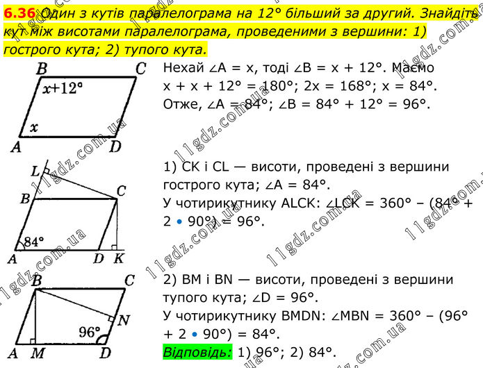 6.36 Один з кутів паралелограма на 12° більший за другий. Знайдіть кут між висотами паралелограма, проведеними з вершини: 1) гострого кута; 2) тупого кута. Нехай ∠A = х, тоді ∠B = х + 12°. Маємо х + х + 12° = 180°; 2х = 168°; х = 84°. Отже, ∠A = 84°; ∠B = 84° + 12° = 96°. 1) CK і CL — висоти, проведені з вершини гострого кута; ∠A = 84°. У чотирикутнику ALCK: ∠LCK = 360° – (84° + 2 • 90°) = 96°. 2) BM і BN — висоти, проведені з вершини тупого кута; ∠D = 96°. У чотирикутнику BMDN: ∠MBN = 360° – (96° + 2 • 90°) = 84°. Відповідь: 1) 96°; 2) 84°.