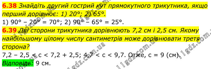 6.38 Знайдіть другий гострий кут прямокутного трикутника, якщо перший дорівнює: 1) 20°; 2) 65°. 1) 90° – 20° = 70°; 2) 90° – 65° = 25°. 6.39 Дві сторони трикутника дорівнюють 7,2 см і 2,5 см. Якому найбільшому цілому числу сантиметрів може дорівнювати третя сторона? 7,2 – 2,5 < с < 7,2 + 2,5; 4,7 < с < 9,7. Отже, с = 9 (см). Відповідь: 9 см.
