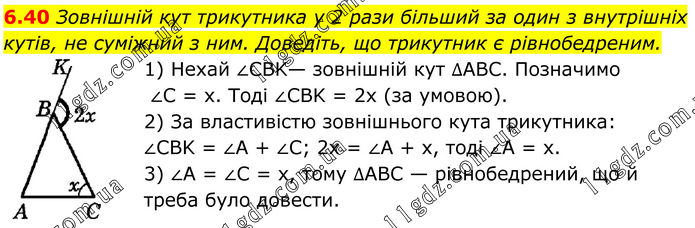 6.40 Зовнішній кут трикутника у 2 рази більший за один з внутрішніх кутів, не суміжний з ним. Доведіть, що трикутник є рівнобедреним. 1) Нехай ∠CBK— зовнішній кут ∆ABC. Позначимо ∠C = х. Тоді ∠CBK = 2х (за умовою). 2) За властивістю зовнішнього кута трикутника: ∠CBK = ∠A + ∠C; 2х = ∠A + х, тоді ∠A = х. 3) ∠A = ∠C = х, тому ∆ABC — рівнобедрений, що й треба було довести.