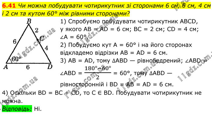 6.41 Чи можна побудувати чотирикутник зі сторонами 6 см, 6 см, 4 см і 2 см та кутом 60° між рівними сторонами? 1) Спробуємо побудувати чотирикутник ABCD, у якого AB = AD = 6 см; BC = 2 см; CD = 4 см; ∠A = 60°. 2) Побудуємо кут А = 60° і на його сторонах відкладемо відрізки AB = AD = 6 см. 3) AB = AD, тому ∆ABD — рівнобедрений; ∠ABD = ∠ABD = (180°-60°)/2 = 60°, тому ∆ABD — рівносторонній і BD = AB = AD = 6 см. 4) Оскільки BD = BC + CD, то C ∈ BD. Побудувати чотирикутник не можна. Відповідь: Ні.