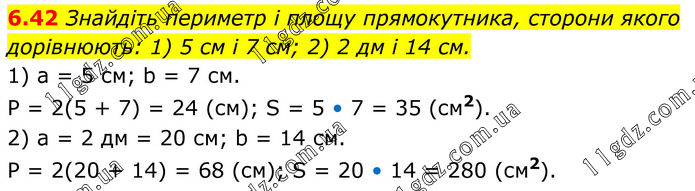 6.42 Знайдіть периметр і площу прямокутника, сторони якого дорівнюють: 1) 5 см і 7 см; 2) 2 дм і 14 см. 1) а = 5 см; b = 7 см. P = 2(5 + 7) = 24 (см); S = 5 • 7 = 35 (см2). 2) а = 2 дм = 20 см; b = 14 см. P = 2(20 + 14) = 68 (см); S = 20 • 14 = 280 (см2).