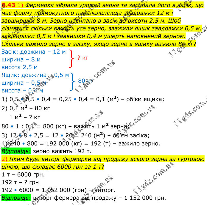 6.43 1) Фермерка зібрала урожай зерна та засипала його в засік, що має форму прямокутного паралелепіпеда завдовжки 12 м і завширшки 8 м. Зерно насипано в засік до висоти 2,5 м. Щоб дізнатися скільки важить усе зерно, зважили ящик завдовжки 0,5 м, завширшки 0,5 м і заввишки 0,4 м ущерть наповнений зерном. Скільки важило зерно в засіку, якщо зерно в ящику важило 80 кг? 1) 0,5 • 0,5 • 0,4 = 0,25 • 0,4 = 0,1 (м2) – об’єм ящика; 2) 0,1 м2 – 80 кг 1 м2 – ? кг 80 • 1 : 0,1 = 800 (кг) – важить 1 м2 зерна; 3) 12 • 8 • 2,5 = 12 • 20 = 240 (м2) – об’єм засіка; 4) 240 • 800 = 192 000 (кг) = 192 (т) – важило зерно. Відповідь: зерно важить 192 т. 2) Яким буде виторг фермерки від продажу всього зерна за гуртовою ціною, що складає 6000 грн за 1 т? 1 т – 6000 грн. 192 т – ? грн 192 • 6000 = 1 152 000 (грн) – виторг. Відповідь: виторг фермера від продажу – 1 152 000 грн.