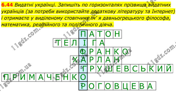 6.44 Видатні українці. Запишіть по горизонталях прізвища видатних українців (за потреби використайте додаткову літературу та Інтернет) і отримаєте у виділеному стовпчику ім’ я давньогрецького філософа, математика, релігійного та політичного діяча.