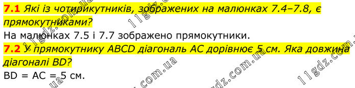 7.1 Які із чотирикутників, зображених на малюнках 7.4–7.8, є прямокутниками? На малюнках 7.5 і 7.7 зображено прямокутники. 7.2 У прямокутнику ABCD діагональ AC дорівнює 5 см. Яка довжина діагоналі BD? BD = AC = 5 см.