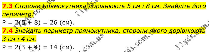 7.3 Сторони прямокутника дорівнюють 5 см і 8 см. Знайдіть його периметр. P = 2(5 + 8) = 26 (см). 7.4 Знайдіть периметр прямокутника, сторони якого дорівнюють 3 см і 4 см. P = 2(3 + 4) = 14 (см).