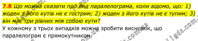 7.8 Що можна сказати про вид паралелограма, коли відомо, що: 1) жоден з його кутів не є гострим; 2) жоден з його кутів не є тупим; 3) він має три рівних між собою кути? У кожному з трьох випадків можна зробити висновок, що паралелограм є прямокутником.