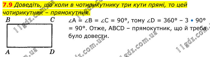 7.9 Доведіть, що коли в чотирикутнику три кути прямі, то цей чотирикутник – прямокутник. ∠А = ∠В = ∠С = 90°, тому ∠D = 360° – 3 • 90° = 90°. Отже, ABCD – прямокутник, що й треба було довести.
