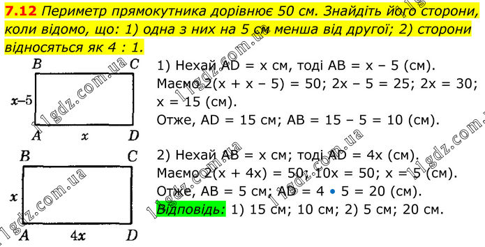 7.12 Периметр прямокутника дорівнює 50 см. Знайдіть його сторони, коли відомо, що: 1) одна з них на 5 см менша від другої; 2) сторони відносяться як 4 : 1. 1) Нехай AD = х см, тоді AB = х – 5 (см). Маємо 2(х + х – 5) = 50; 2х – 5 = 25; 2х = 30; х = 15 (см). Отже, AD = 15 см; AB = 15 – 5 = 10 (см). 2) Нехай AB = х см; тоді AD = 4х (см). Маємо 2(х + 4х) = 50; 10x = 50; х = 5 (см). Отже, AB = 5 см; AD = 4 • 5 = 20 (см). Відповідь: 1) 15 см; 10 см; 2) 5 см; 20 см.