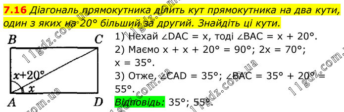 7.16 Діагональ прямокутника ділить кут прямокутника на два кути, один з яких на 20° більший за другий. Знайдіть ці кути. 1) Нехай ∠DAC = х, тоді ∠BAC = х + 20°. 2) Маємо х + х + 20° = 90°; 2х = 70°; х = 35°. 3) Отже, ∠CAD = 35°; ∠BAC = 35° + 20° = 55°. Відповідь: 35°; 55°.