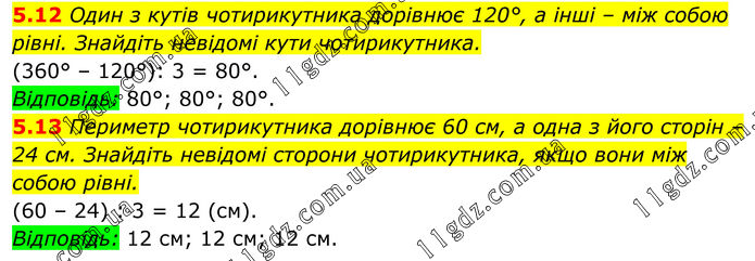 5.12 Один з кутів чотирикутника дорівнює 120°, а інші – між собою рівні. Знайдіть невідомі кути чотирикутника. (360° – 120°): 3 = 80°. Відповідь: 80°; 80°; 80°. 5.13 Периметр чотирикутника дорівнює 60 см, а одна з його сторін – 24 см. Знайдіть невідомі сторони чотирикутника, якщо вони між собою рівні. (60 – 24) : 3 = 12 (см). Відповідь: 12 см; 12 см; 12 см.
