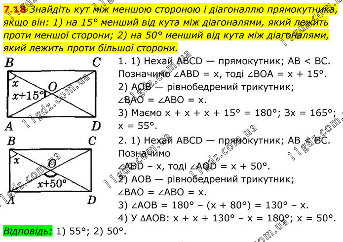 7.18 Знайдіть кут між меншою стороною і діагоналлю прямокутника, якщо він: 1) на 15° менший від кута між діагоналями, який лежить проти меншої сторони; 2) на 50° менший від кута між діагоналями, який лежить проти більшої сторони. 1. 1) Нехай ABCD — прямокутник; AB < BC. Позначимо ∠ABD = х, тоді ∠BOA = х + 15°. 2) AOB — рівнобедрений трикутник; ∠BAO = ∠ABO = х. 3) Маємо х + х + х + 15° = 180°; Зх = 165°; х = 55°. 2. 1) Нехай ABCD — прямокутник; AB < BC. Позначимо ∠ABD – х, тоді ∠AOD = х + 50°. 2) AOB — рівнобедрений трикутник; ∠BAO = ∠ABO = х. 3) ∠AOB = 180° – (х + 80°) = 130° – х. 4) У ∆АОВ: х + х + 130° – х = 180°; х = 50°. Відповідь: 1) 55°; 2) 50°.