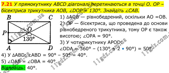 7.21 У прямокутнику ABCD діагоналі перетинаються в точці O. OP – бісектриса трикутника AOB, ∠DOP = 130°. Знайдіть ∠CAB. 1) ∆AOB — рівнобедрений, оскільки AO =OB. 2) OP — бісектриса, що проведена до основи рівнобедреного трикутника, тому OP є також висотою; ∠OPA = 90°. 3) У чотирикутнику APOD: ∠ODA = 360° – (130° + 2 • 90°) = 50°. 4) У ∆ABD: ∠ABD = 90° – 50° = 40°. 5) ∠OAB = ∠OBA = 40°. Відповідь: 40°.