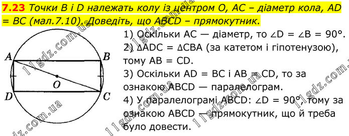 7.23 Точки В і D належать колу із центром О, AC – діаметр кола, AD = BC (мал.7.10). Доведіть, що ABCD – прямокутник. 1) Оскільки AC — діаметр, то ∠D = ∠B = 90°. 2) ∆ADC = ∆CBA (за катетом і гіпотенузою), тому AB = CD. 3) Оскільки AD = BC і AB = CD, то за ознакою ABCD — паралелограм. 4) У паралелограмі ABCD: ∠D = 90°, тому за ознакою ABCD — прямокутник, що й треба було довести.