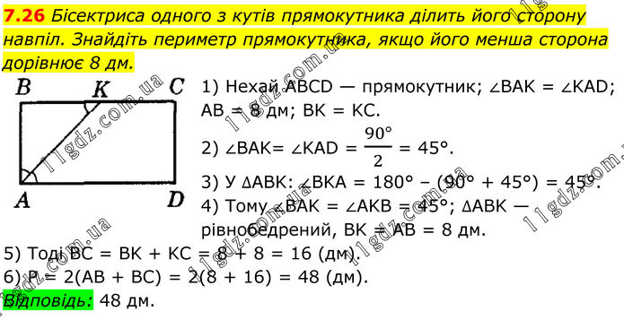 7.26 Бісектриса одного з кутів прямокутника ділить його сторону навпіл. Знайдіть периметр прямокутника, якщо його менша сторона дорівнює 8 дм. 1) Нехай ABCD — прямокутник; ∠BAK = ∠KAD; AB = 8 дм; BK = KC. 2) ∠BAK= ∠KAD = (90°)/2 = 45°. 3) У ∆ABK: ∠BKA = 180° – (90° + 45°) = 45°. 4) Тому ∠BAK = ∠AKB = 45°; ∆ABK — рівнобедрений, BK = AB = 8 дм. 5) Тоді BC = BK + KC = 8 + 8 = 16 (дм). 6) P = 2(АВ + BC) = 2(8 + 16) = 48 (дм). Відповідь: 48 дм.