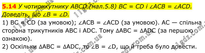 5.14 У чотирикутнику ABCD (мал.5.8) BC = CD і ∠ACB = ∠ACD. Доведіть, що ∠B = ∠D. 1) BC = CD (за умовою); ∠ACB = ∠ACD (за умовою). AC — спільна сторона трикутників ABC і ADC. Тому ∆ABC = ∆ADC (за першою ознакою). 2) Оскільки ∆ABC = ∆ADC, то ∠B = ∠D, що й треба було довести.