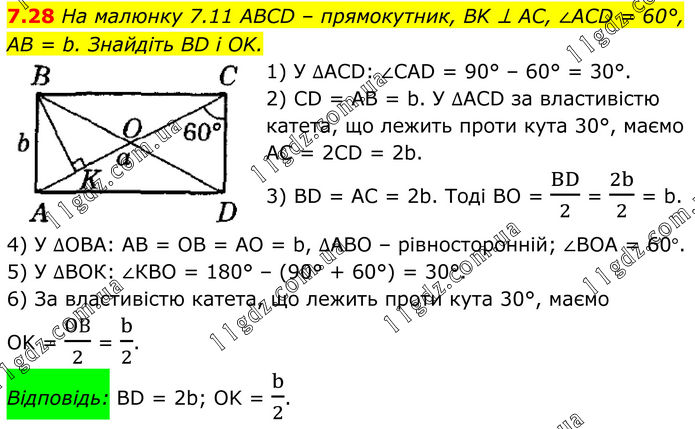 7.28 На малюнку 7.11 ABCD – прямокутник, BK ⊥ AC, ∠ACD = 60°, AB = b. Знайдіть BD і OK. 1) У ∆ACD: ∠CAD = 90° – 60° = 30°. 2) CD = AB = b. У ∆ACD за властивістю катета, що лежить проти кута 30°, маємо AC = 2CD = 2b. 3) BD = AC = 2b. Тоді BO = BD/2 = 2b/2 = b. 4) У ∆ОВА: AB = OB = AO = b, ∆ABO – рівносторонній; ∠ВОА = 60°. 5) У ∆ВОК: ∠КВО = 180° – (90° + 60°) = 30°. 6) За властивістю катета, що лежить проти кута 30°, маємо OK = ОВ/2 = b/2. Відповідь: BD = 2b; OK = b/2.