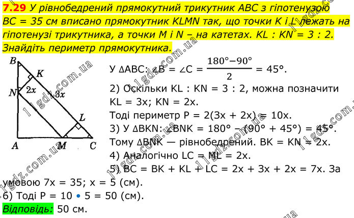 7.29 У рівнобедрений прямокутний трикутник ABC з гіпотенузою BC = 35 см вписано прямокутник KLMN так, що точки K і L лежать на гіпотенузі трикутника, а точки M і N – на катетах. KL : KN = 3 : 2. Знайдіть периметр прямокутника. У ∆АВС: ∠В = ∠C = (180°-90°)/2 = 45°. 2) Оскільки KL : KN = 3 : 2, можна позначити KL = 3x; KN = 2x. Тоді периметр P = 2(Зx + 2х) = 10x. 3) У ∆BKN: ∠BNK = 180° – (90° + 45°) = 45°. Тому ∆BNK — рівнобедрений. BK = KN = 2х. 4) Аналогічно LC = ML = 2х. 5) BC = BK + KL + LC = 2х + Зх + 2х = 7х. За умовою 7x = 35; х = 5 (см). 6) Тоді Р = 10 • 5 = 50 (см). Відповідь: 50 см.