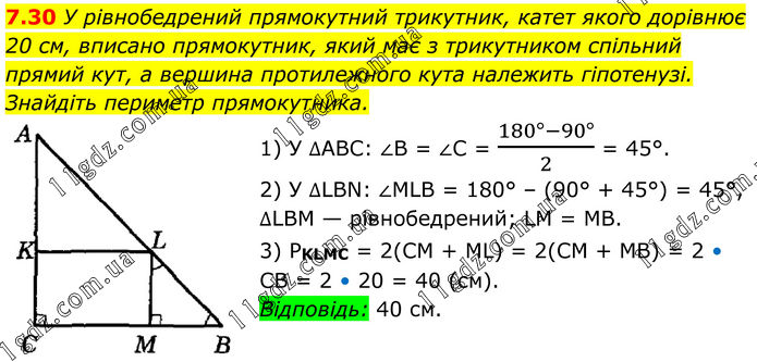 7.30 У рівнобедрений прямокутний трикутник, катет якого дорівнює 20 см, вписано прямокутник, який має з трикутником спільний прямий кут, а вершина протилежного кута належить гіпотенузі. Знайдіть периметр прямокутника. 1) У ∆АВС: ∠В = ∠С = (180°-90°)/2 = 45°. 2) У ∆LBN: ∠MLB = 180° – (90° + 45°) = 45°, ∆LBM — рівнобедрений; LM = MB. 3) РKLMC = 2(CM + ML) = 2(CM + MB) = 2 • CB = 2 • 20 = 40 (см). Відповідь: 40 см.