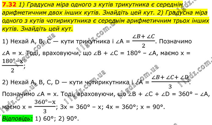 7.32 1) Градусна міра одного з кутів трикутника є середнім арифметичним двох інших кутів. Знайдіть цей кут. 2) Градусна міра одного з кутів чотирикутника є середнім арифметичним трьох інших кутів. Знайдіть цей кут. 1) Нехай А, В, C — кути трикутника і ∠A = (∠B+ ∠C)/2. Позначимо ∠A = х. Тоді, враховуючи, що ∠B + ∠C = 180° – ∠A, маємо х = (180°-x)/2; 2) Нехай А, В, С, D — кути чотирикутника і ∠A = (∠B+ ∠C+ ∠D)/3. Позначимо ∠A = х. Тоді, враховуючи, що ∠B + ∠C + ∠D = 360° – ∠A, маємо х = (360°-x)/3; Зх = 360° – х; 4x = 360°; х = 90°. Відповідь: 1) 60°; 2) 90°.