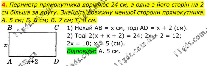 4. Периметр прямокутника дорівнює 24 см, а одна з його сторін на 2 см більша за другу. Знайдіть довжину меншої сторони прямокутника. A. 5 см; Б. 6 см; В. 7 см; Г. 8 см. 1) Нехай AB = х см, тоді AD = х + 2 (см). 2) Тоді 2(х + х + 2) = 24; 2х + 2 = 12; 2х = 10; х = 5 (см). Відповідь: А. 5 см.