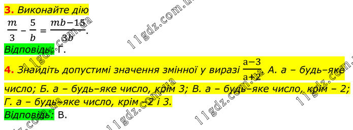 3. Виконайте дію m/3 – 5/b = (mb-15)/3b. Відповідь: Г. 4. Знайдіть допустимі значення змінної у виразі (а-3)/(а+2). A. a – будь–яке число; Б. a – будь–яке число, крім 3; B. a – будь–яке число, крім – 2; Г. a – будь–яке число, крім –2 і 3. Відповідь: В.