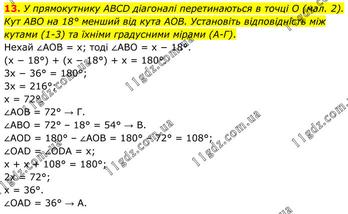 13. У прямокутнику ABCD діагоналі перетинаються в точці O (мал. 2). Кут ABO на 18° менший від кута АОВ. Установіть відповідність між кутами (1-3) та їхніми градусними мірами (А-Г). Нехай ∠AOB = x; тоді ∠ABO = x − 18°. (x − 18°) + (x − 18°) + x = 180°. 3x − 36° = 180°; 3x = 216°; x = 72°. ∠AOB = 72° → Г. ∠ABO = 72° – 18° = 54° → В. ∠AOD = 180° – ∠AOB = 180° – 72° = 108°; ∠OAD = ∠ODA = x; x + x + 108° = 180°; 2x = 72°; x = 36°. ∠OAD = 36° → А.