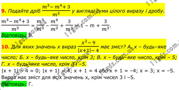 9. Подайте дріб (m^3- m^4+ 3)/m^3 у вигляді суми цілого виразу і дробу. (m^3- m^4+ 3)/m^3 = m^3/m^3 – m^4/m^3 + 3/m^3 = 1 – m + 3/m^3 . Відповідь: В. 10. Для яких значень x вираз (x^2- 9)/(|x+1|- 4) має зміст? A. x – будь–яке число; Б. x – будь–яке число, крім 3; B. x – будь–яке число, крім – 5; Г. x – будь–яке число, крім 3 і –5. |х + 1| – 4 = 0; |x + 1| = 4; х + 1 = 4 або x + 1 = –4; x = 3; х = –5. Вираз має зміст для всіх значень х, крім чисел 3 і –5. Відповідь: Г.