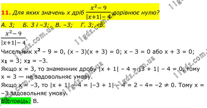 Для яких значень х дріб (x^2- 9)/(|x+1|- 4) дорівнює нулю? А. 3; Б. 3 і –3; В. –3; Г. 3; –5. (x^2- 9)/(|x+1|- 4). Чисельник x2 – 9 = 0, (х – 3)(х + 3) = 0; х – З = 0 або х + 3 = 0; x1 = 3; x2 = –3. Якщо х = 3, то знаменник дробу |х + 1| – 4 = |3 + 1| – 4 = 0, тому х = 3 — не задовольняє умову. Якщо х = –3, то |x + 1| – 4 = |–3 + 1| – 4 = 2 – 4= –2 ≠ 0. Тому х = –3 задовольняє умову. Відповідь: В.