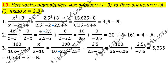 Установіть відповідність між виразом (1–3) та його значенням (А–Г), якщо х = 2,5. 1. (x^3+8)/(x^2-2х+4) = (〖2,5〗^3+8)/(〖2,5〗^2-2 •2,5+4) = (15,625+8)/(6,25-5+4) = 4,5 – Б. 2. 4х/(х-2) + 8/(2-х) = (4 •2,5)/(2,5-2) + 8/(2-2,5) = 10/0,5 + 8/(-0,5) = 20 + (−16) = 4 – А. 3. 100/〖10х- x〗^2 + х/(х-10) = 100/〖10 •2,5- 2,5〗^2 + 2,5/(2,5-10) = 100/(25-6,25) + 2,5/(-7,5) = 5,333 − 0,333 = 5 – В.