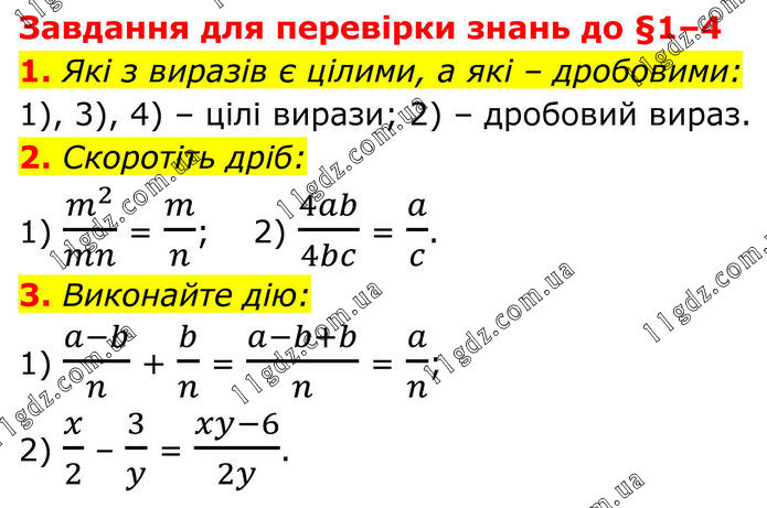 Завдання для перевірки знань до §1–4 1. Які з виразів є цілими, а які – дробовими: 1), 3), 4) – цілі вирази; 2) – дробовий вираз. 2. Скоротіть дріб: 1) m^2/mn = m/n; 2) 4ab/4bc = a/c. 3. Виконайте дію: 1) (a-b)/n + b/n = (a-b+b)/n = a/n; 2) x/2 – 3/y = (xy-6)/2y.
