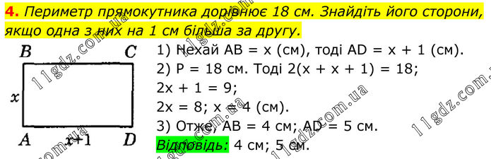 4. Периметр прямокутника дорівнює 18 см. Знайдіть його сторони, якщо одна з них на 1 см більша за другу. 1) Нехай AB = х (см), тоді AD = х + 1 (см). 2) P = 18 см. Тоді 2(х + х + 1) = 18; 2х + 1 = 9; 2х = 8; х = 4 (см). 3) Отже, AB = 4 см; AD = 5 см. Відповідь: 4 см; 5 см.
