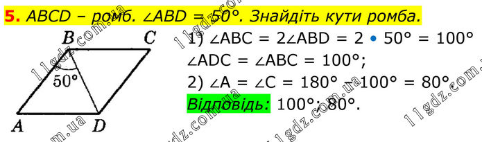 5. ABCD – ромб. ∠ABD = 50°. Знайдіть кути ромба. 1) ∠ABC = 2∠ABD = 2 • 50° = 100°; ∠ADC = ∠ABC = 100°; 2) ∠A = ∠C = 180° – 100° = 80°. Відповідь: 100°; 80°.