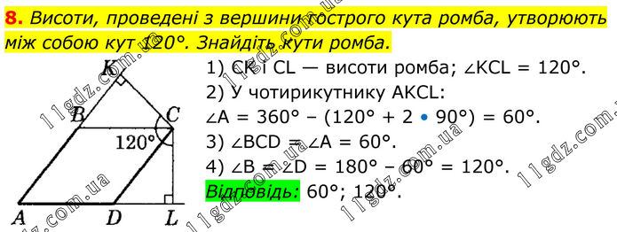 8. Висоти, проведені з вершини гострого кута ромба, утворюють між собою кут 120°. Знайдіть кути ромба. 1) CK і CL — висоти ромба; ∠KCL = 120°. 2) У чотирикутнику AKCL: ∠A = 360° – (120° + 2 • 90°) = 60°. 3) ∠BCD = ∠A = 60°. 4) ∠B = ∠D = 180° – 60° = 120°. Відповідь: 60°; 120°.