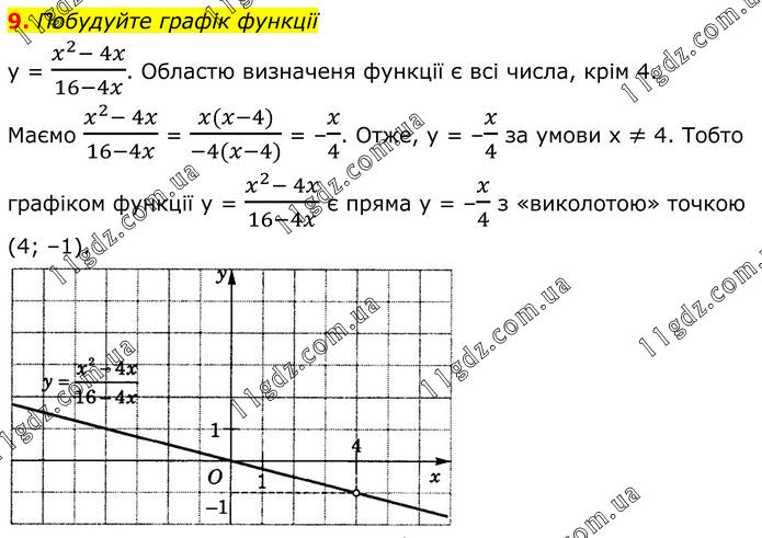 Побудуйте графік функції y = (x^2- 4x)/(16-4x). Областю визначеня функції є всі числа, крім 4. Маємо (x^2- 4x)/(16-4x) = (x(x-4))/(-4(x-4)) = –x/4. Отже, у = –x/4 за умови х ≠ 4. Тобто графіком функції у = (x^2- 4x)/(16-4x) є пряма у = –x/4 з «виколотою» точкою (4; –1).