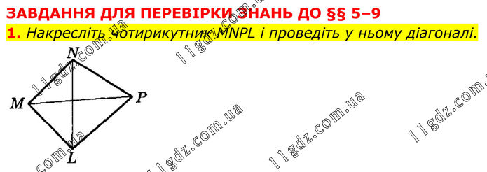 ЗАВДАННЯ ДЛЯ ПЕРЕВІРКИ ЗНАНЬ ДО §§ 5–9 1. Накресліть чотирикутник MNPL і проведіть у ньому діагоналі.
