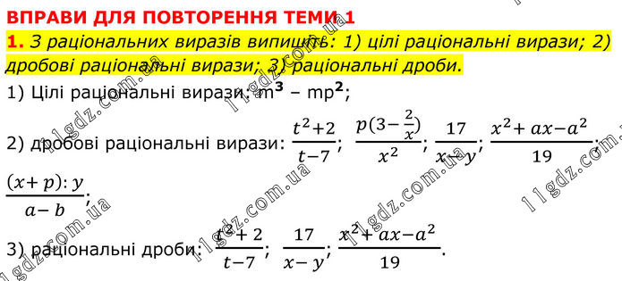 ВПРАВИ ДЛЯ ПОВТОРЕННЯ ТЕМИ 1 1. З раціональних виразів випишіть: 1) цілі раціональні вирази; 2) дробові раціональні вирази; 3) раціональні дроби. 1) Цілі раціональні вирази: m3 – mp2; 2) дробові раціональні вирази: (t^2+2)/(t-7); (p(3- 2/x))/x^2 ; 17/(x- y); (x^2+ ax-a^2 )/19; ((x+ p): y)/(a- b); 3) раціональні дроби: (t^2+ 2)/(t-7); 17/(x- y); (x^2+ ax-a^2 )/19.