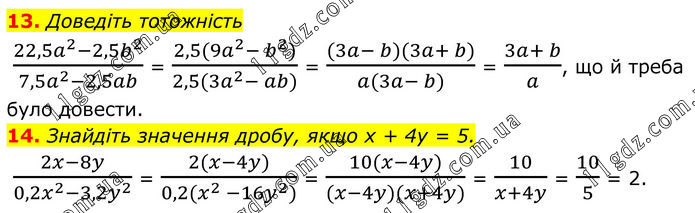 13. Доведіть тотожність (22,5a^2-2,5b^2)/(7,5a^2-2,5ab) = (2,5(9a^2- b^2))/(2,5(3a^2- ab)) = ((3a- b)(3a+ b))/(a(3a- b)) = (3a+ b)/a, що й треба було довести. 14. Знайдіть значення дробу, якщо х + 4у = 5. (2x-8y)/(0,2x^2-3,2y^2 ) = (2(x-4y))/(0,2(x^2 -16y^2)) = (10(x-4y))/((x-4y)(x+4y)) = 10/(x+4y) = 10/5 = 2.