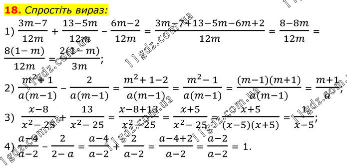 Виконайте дію: 1) 4m/7 + m/7 = 5m/7; 3) (m- n)/p + n/p = (m-n+n)/p = m/p; 2) 9p/8a – 2p/8a = 7p/8a; 4) (12a^2)/5m – (3a^2)/5m = (9a^2)/5m.
