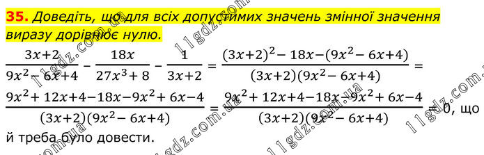 Доведіть, що для всіх допустимих значень змінної значення виразу дорівнює нулю. (3x+2)/(9x^2- 6x+4) – 18x/(27x^3+ 8) – 1/(3x+2) = ((3x+2)^2- 18x-(9x^2- 6x+4))/((3x+2)(9x^2- 6x+4)) = (9x^2+ 12x+4-18x-9x^2+ 6x-4)/((3x+2)(9x^2- 6x+4)) = (9x^2+ 12x+4-18x-9x^2+ 6x-4)/((3x+2)(9x^2- 6x+4)) = 0, що й треба було довести.