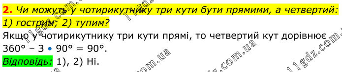 2. Чи можуть у чотирикутнику три кути бути прямими, а четвертий: 1) гострим; 2) тупим? Якщо у чотирикутнику три кути прямі, то четвертий кут дорівнює 360° – З • 90° = 90°. Відповідь: 1), 2) Ні.