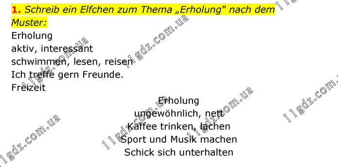 1. Schreib ein Elfchen zum Thema „Erholung“ nach dem Muster: Erholung aktiv, interessant schwimmen, lesen, reisen Ich treffe gern Freunde. Freizeit Erholung ungewöhnlich, nett Kaffee trinken, lachen Sport und Musik machen Schick sich unterhalten