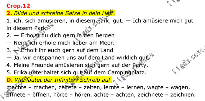 Стор.12 2. Bilde und schreibe Satze in dein Heft. 1. ich. sich amüsieren, in diesem Park, gut. — Ich amüsiere mich gut in diesem Park. 2. — Erholst du dich gern in den Bergen — Nein, ich erhole mich lieber am Meer. 3. — Erholt ihr euch gern auf dem Land — Ja, wir entspannen uns auf dem Land wirklich gut. 4. Meine Freunde amüsieren sich gern auf der Party. 5. Erika unterhaltet sich gut auf dem Campingplatz. D. Wie lautet der Infinitiv? Schreib auf. machte – machen, zeltete – zelten, lernte – lernen, wagte – wagen, öffnete – öffnen, hörte – hören, achte – achten, zeichnete – zeichnen.