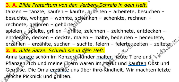3. A. Bilde Prateritum von den Verben. Schreib in dein Heft. tanzen — tanzte, kaufen – kaufte, arbeiten – arbeitete, besuchen – besuchte, wohnen – wohnte, schenken – schenkte, rechnen – rechnete, gehören – gehörte. spielen – spielte, grillen – grillte, zeichnen – zeichnete, entdecken – entdeckte, decken – deckte, malen – malte, bedeuten – bedeutete, erzählen – erzählte, suchen – suchte, feiern – feierte, zelten – zeltete. 3. B. Bilde Satze. Schreib sie in dein Heft. Anna tanzte schön im Konzert. Kinder malten heute Tiere und Pflanzen. Ich und meine Eltern waren im Markt und kauften Obst und Gemüse. Die Oma erzählte uns über ihre Kindheit. Wir machten letzte Woche Picknick und grillten.