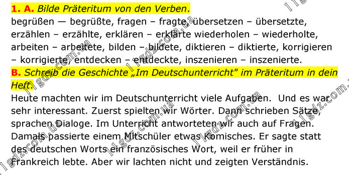 1. A. Bilde Präteritum von den Verben. begrüßen — begrüßte, fragen – fragte, übersetzen – übersetzte, erzählen – erzählte, erklären – erklärte wiederholen – wiederholte, arbeiten – arbeitete, bilden – bildete, diktieren – diktierte, korrigieren – korrigierte, entdecken – entdeckte, inszenieren – inszenierte. B. Schreib die Geschichte „Im Deutschunterricht" im Präteritum in dein Heft. Heute machten wir im Deutschunterricht viele Aufgaben. Und es war sehr interessant. Zuerst spielten wir Wörter. Dann schrieben Sätze, sprachen Dialoge. Im Unterricht antworteten wir auch auf Fragen. Damals passierte einem Mitschüler etwas Komisches. Er sagte statt des deutschen Worts ein französisches Wort, weil er früher in Frankreich lebte. Aber wir lachten nicht und zeigten Verständnis.