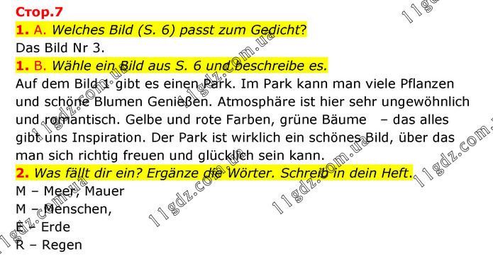 Стор.7 1. A. Welches Bild (S. 6) passt zum Gedicht? Das Bild Nr 3. 1. B. Wähle ein Bild aus S. 6 und beschreibe es. Auf dem Bild 1 gibt es einen Park. Im Park kann man viele Pflanzen und schöne Blumen Genießen. Atmosphäre ist hier sehr ungewöhnlich und romantisch. Gelbe und rote Farben, grüne Bäume – das alles gibt uns Inspiration. Der Park ist wirklich ein schönes Bild, über das man sich richtig freuen und glücklich sein kann. 2. Was fällt dir ein? Ergänze die Wörter. Schreib in dein Heft. M – Meer, Mauer M – Menschen, E – Erde R – Regen