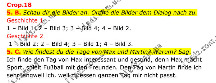 Стор.18 5. B. Schau dir die Bilder an. Ordne die Bilder dem Dialog nach zu. Geschichte 1 1 – Bild 1; 2 – Bild 3; 3 – Bild 4; 4 – Bild 2. Geschichte 2 1 – Bild 2; 2 – Bild 4; 3 – Bild 1; 4 – Bild 3. 5. C. Wie findest du die Tage von Max und Martin? Warum? Sag. Ich finde den Tag von Max interessant und gesund, denn Max macht Sport, spielt Fußball mit den Freunden. Den Tag von Martin finde ich sehr langweil ich, weil zu essen ganzen Tag mir nicht passt.